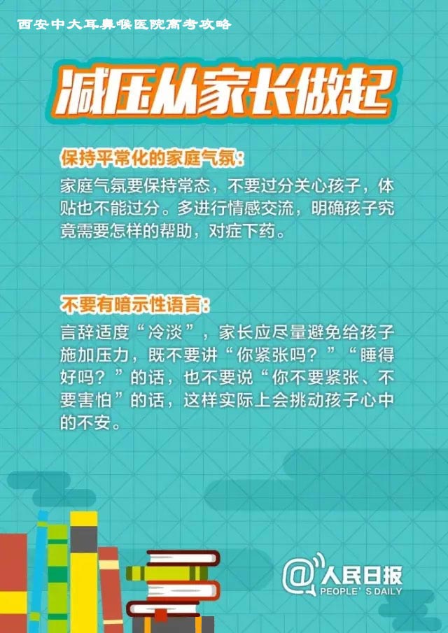 今天西安新城中大耳鼻喉医院为大家分别整理了给家长和考生们的备考建议、减压方法、考前注意事项及饮食安排,助力2017考生冲刺高考!